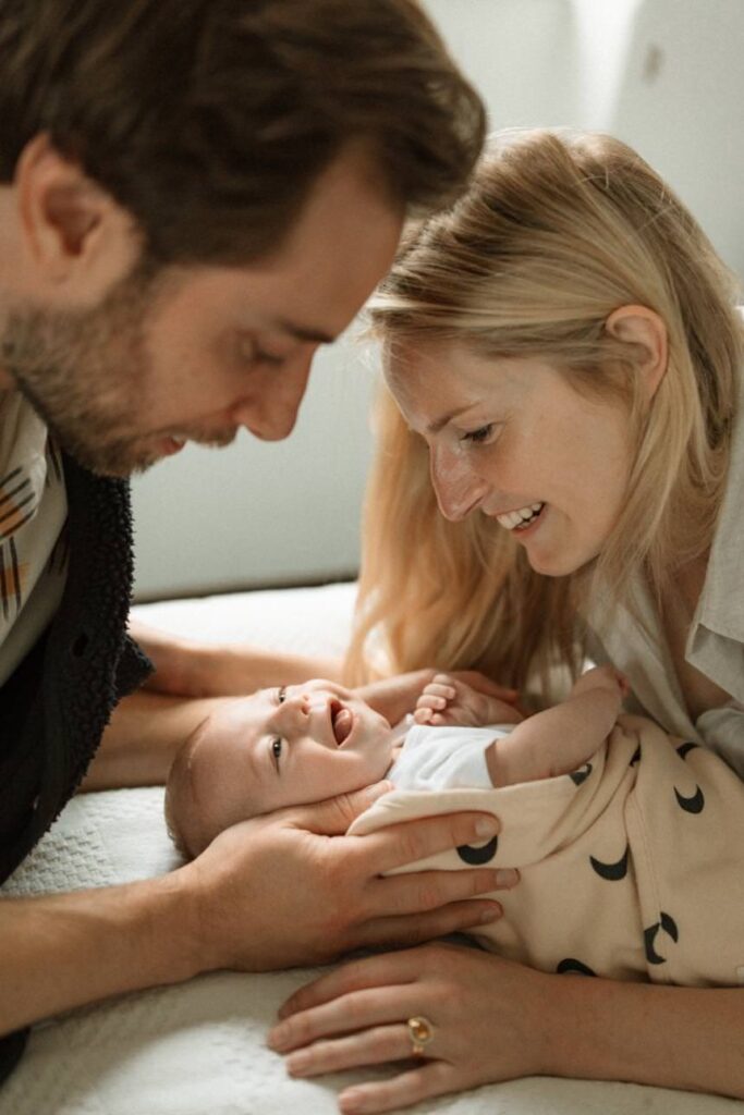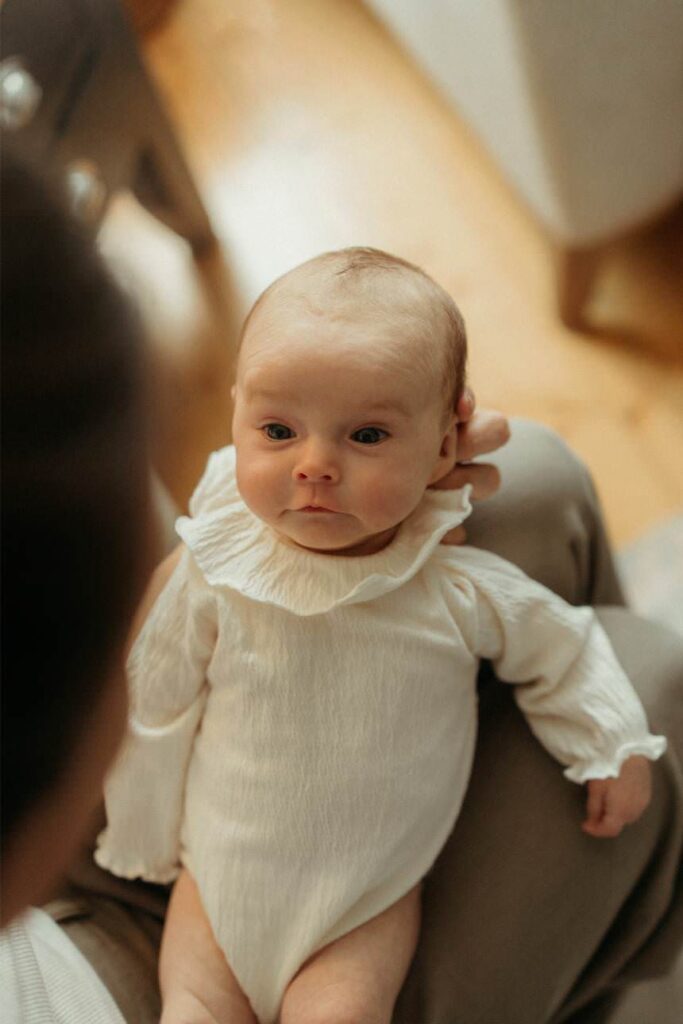 Your baby might be a little more alert now, stretching, looking around, perhaps not sleeping as much during the session (and that’s completely fine). We just follow their lead. It’s a lovely in-between stage: still very much newborn, but with those first signs of connection, eye contact, little sounds, tiny facial expressions.